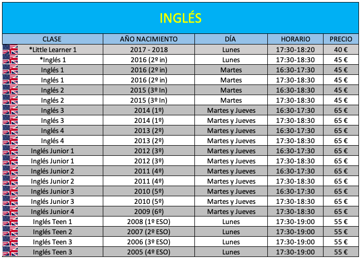 *Además del precio mensual de las extraescolares existe una matrícula de 35€. Este importe se descuenta de la mensualidad de mayo, en caso de que el alumno haya realizado el curso completo.